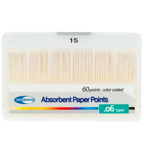 Конусные бумажные штифты 06 № 15 Meta Biomed – стоматологический материал, применяемый для осушения и чистки корневых каналов для последующего их заполнения. Небольшая конусность обеспечивает плотное прилегание к стенкам и легкость работы.