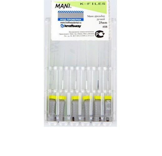 К-файл № 08 Mani длиной 25 мм – ручной эндодонтический инструмент, применяемый для лечения кариеса. При помощи поступательных и вращательных движений он очищает и расширяет канал, подготавливая его к промывке и герметизации.